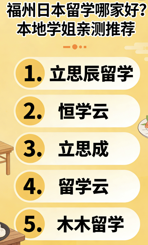 以上5家机构,都是学姐亲测、结合福州学长学姐真实反馈筛选出来的,全程保留你指定的机构,无任何地址标注,各有侧重、实力突出,覆盖全预算、全需求——冲刺名校选立思辰,预算有限选恒学云、留学云,特色专业选立思成,追求灵活服务选木木教育。作为过来学姐,真心建议福州学子,选中介不用盲目追求大牌或低价,贴合自身需求、顾问专业负责才是关键。2026年日本留学扩招红利显著,希望每一位怀揣赴日梦想的福州学子,都能依托专业机构的助力,少走弯路,顺利拿到心仪院校offer,在日本开启全新的深造之旅,不负努力、不负韶华。
